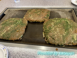 今回は3人分なので、鉄板は3枚のお好み焼きで