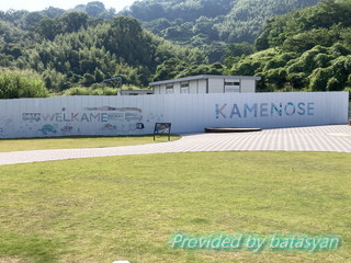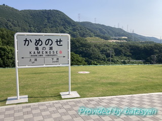 崖の方には亀の瀬をバックにした標識が