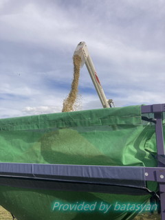 コンバインから軽トラに米を乗せて